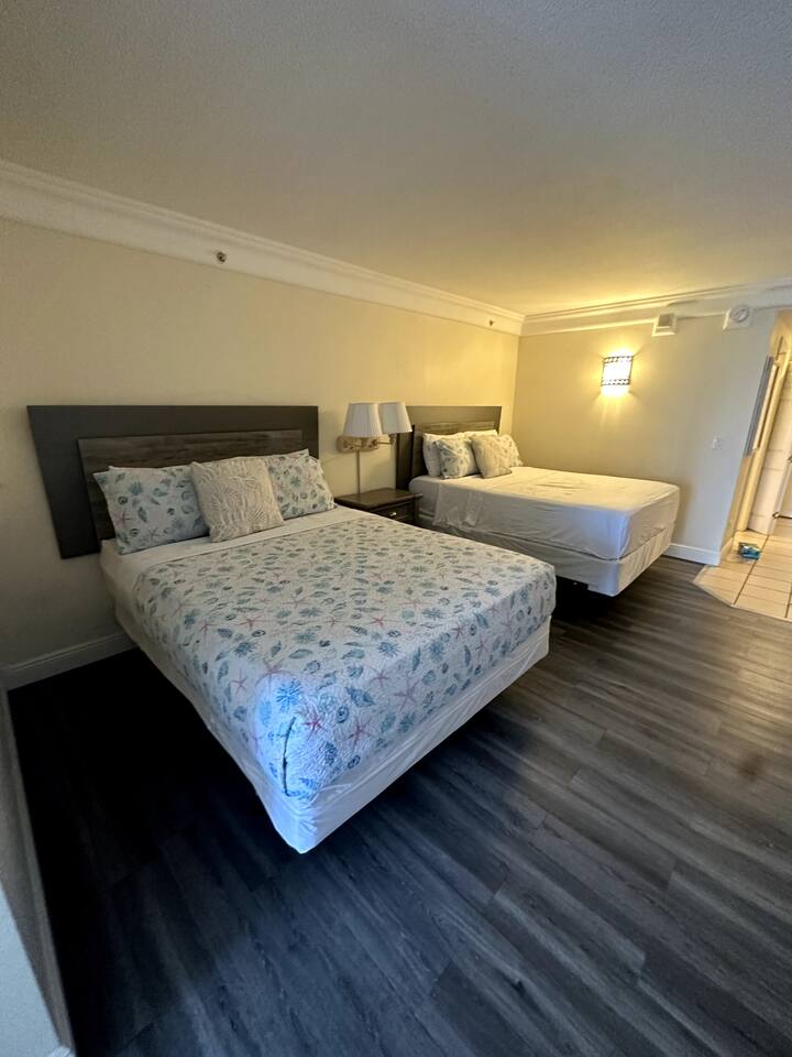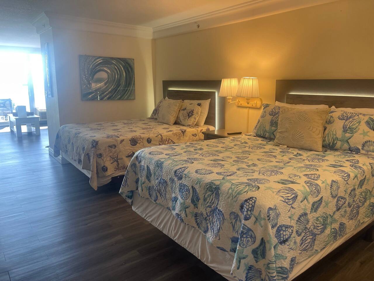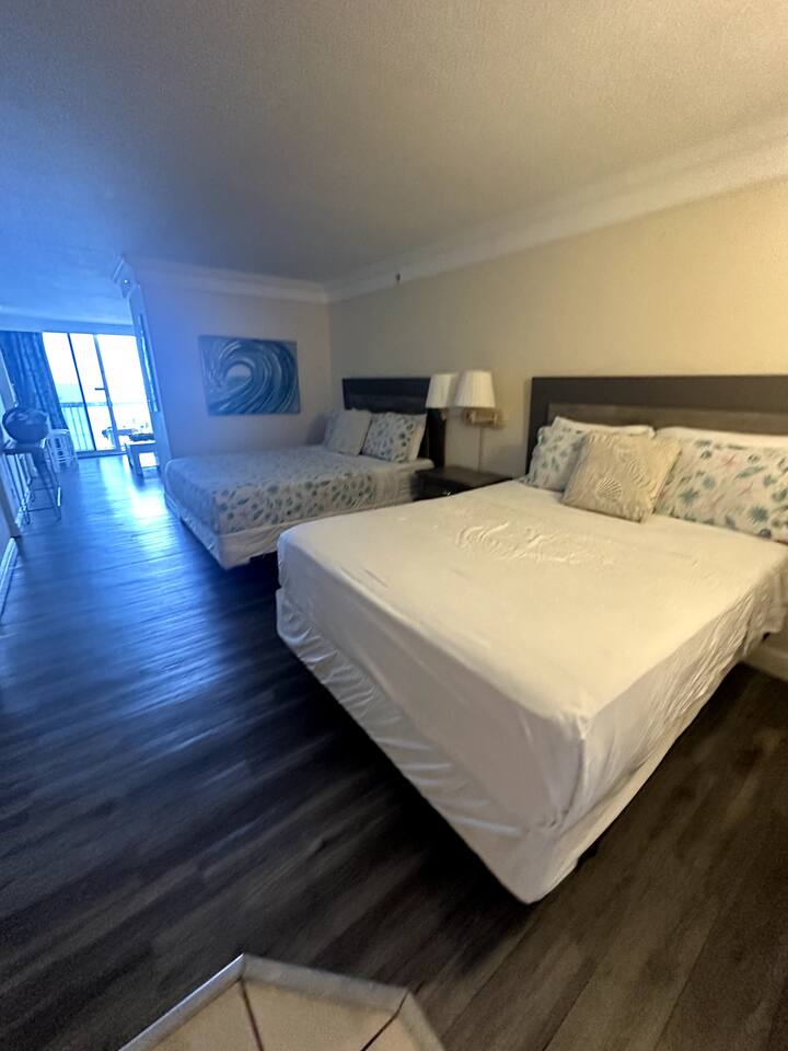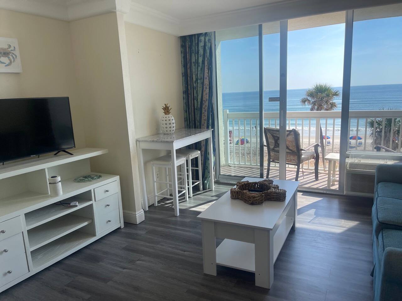 2 Queen Beds and a Queen Pullout with kitchenette, DIRECT OCEAN FRONT unit. The property has no amenities open, so the price reflects that. Looking for great guests who want an affordable vacation with Beach Access from the building who will take care of property! This is perfect for a family! Shopping across the way with a Publix for easy convenient meals. PRIVATE BALCONY TO ENJOY COFFEE/COCKTAILS ON. Perfect property to spend day at the beach or other Daytona offerings.